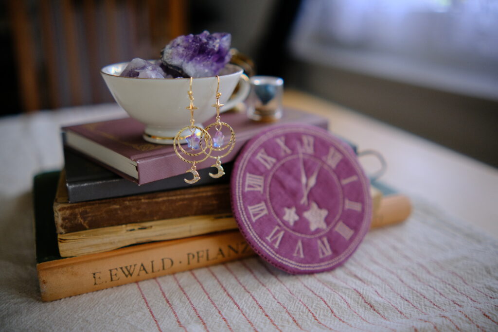 (A) A finely embroidered Celestial Timekeeper, appearing in the shape of a pocketwatch face. Crafted in deep plum linen and lavender thread, its hands are fixed at a specific hour: a time to open portals to other worlds. While its practical function is humble (used to cradle tea cups or ink bottles), the thread is imbued with stardust, believed to remember thoughts written nearby.